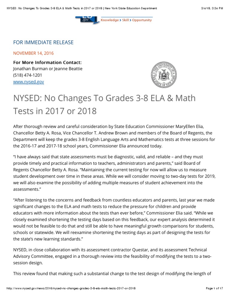 Nysed No Changes To Grades 3 8 Ela Math Tests In 2017 Or 2018