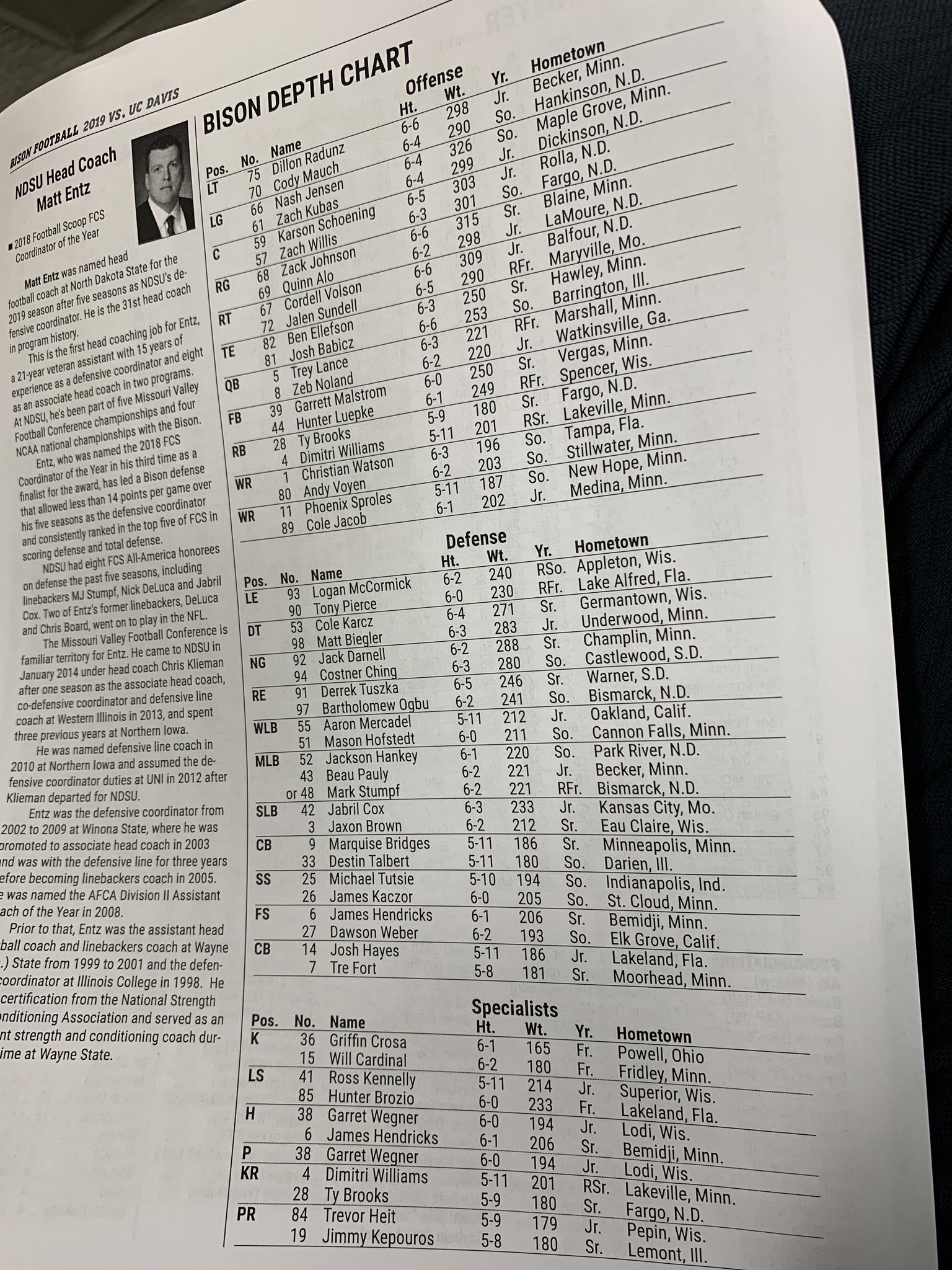2019 Ndsu Football Roster By Class And Depth Chart Page 19