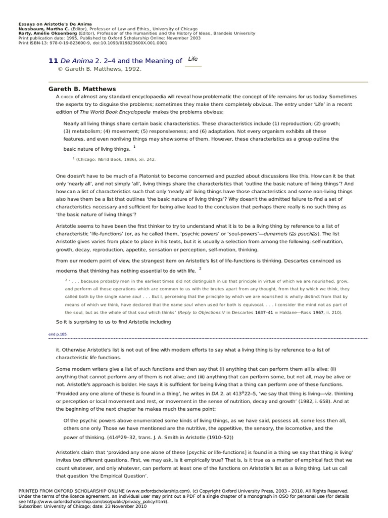 Gareth Matthews De Anima Aristotle Species