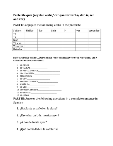 Preterite Quiz Regular And Spelling Change Verbs Teaching Resources