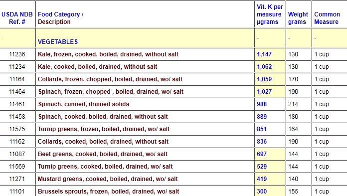 Vitamin K Foods Chart